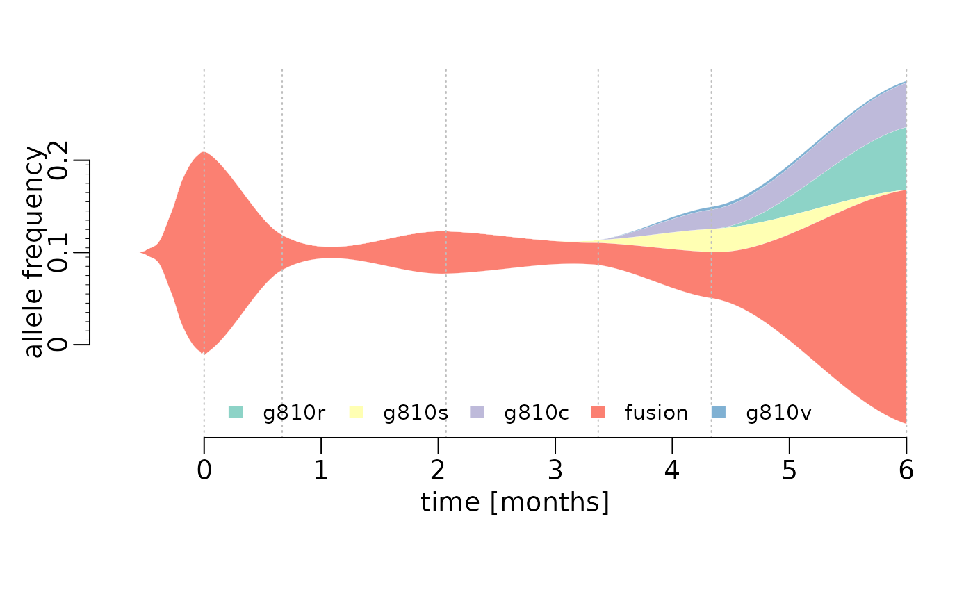 This shows how to create a stream graph using base R, such as the one in Figure 1B (Solomon et al. 2020). The graph shows the allele frequencies of a founder fusion mutation and G810 substitution mutations that emerged over time.